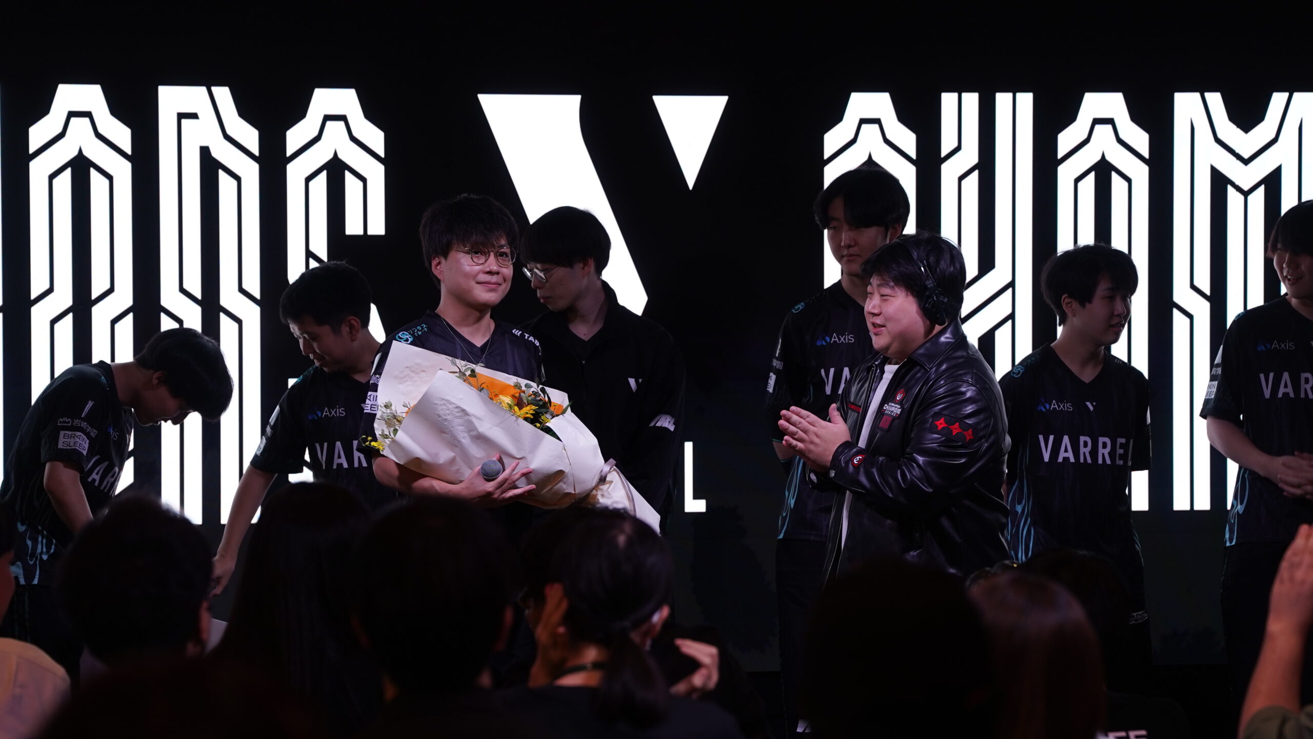 WDG JAPAN社長様から記念ボードと花束を贈呈されるVARREL。