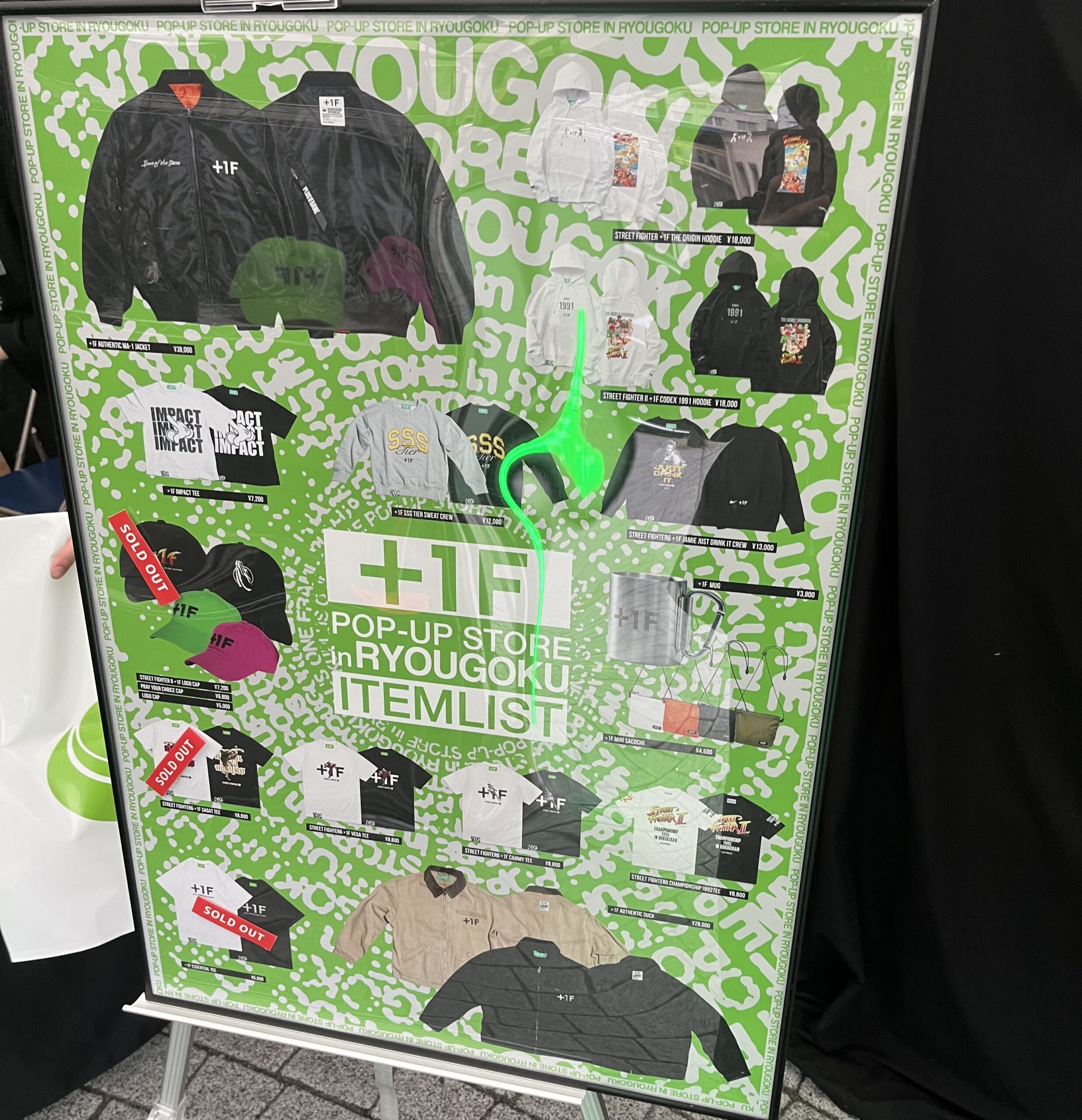 駅から会場へ向かう途中には、+1F POP-UP STORE in RYOGOKUが開催されており、Tシャツやパーカー、MA-1など、アパレル商品を取り扱っていた。