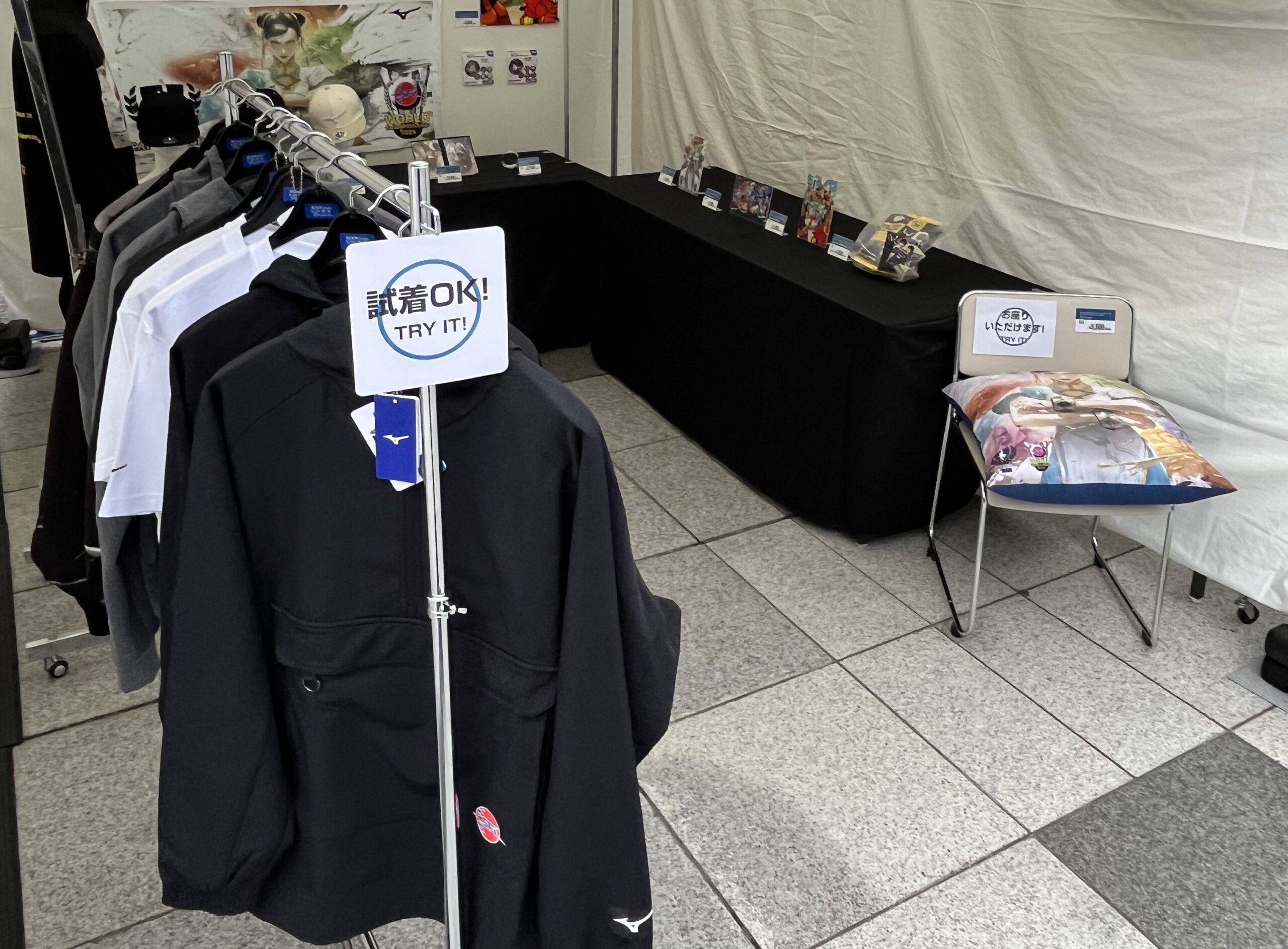 会場外では公式グッズの展示が行われており、来場者はテント内のサンプルで試着を行ってから、グッズを購入することができた。