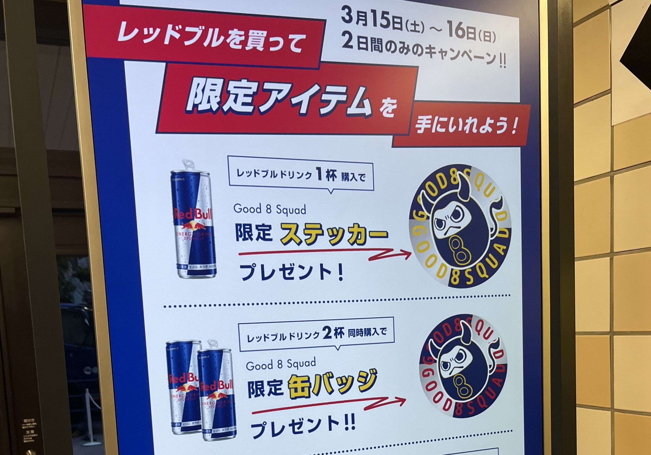 Red Bullブースでは、Red Bullを購入することで、『Good 8 Squad』とのコラボステッカーと缶バッジを入手可能であった。