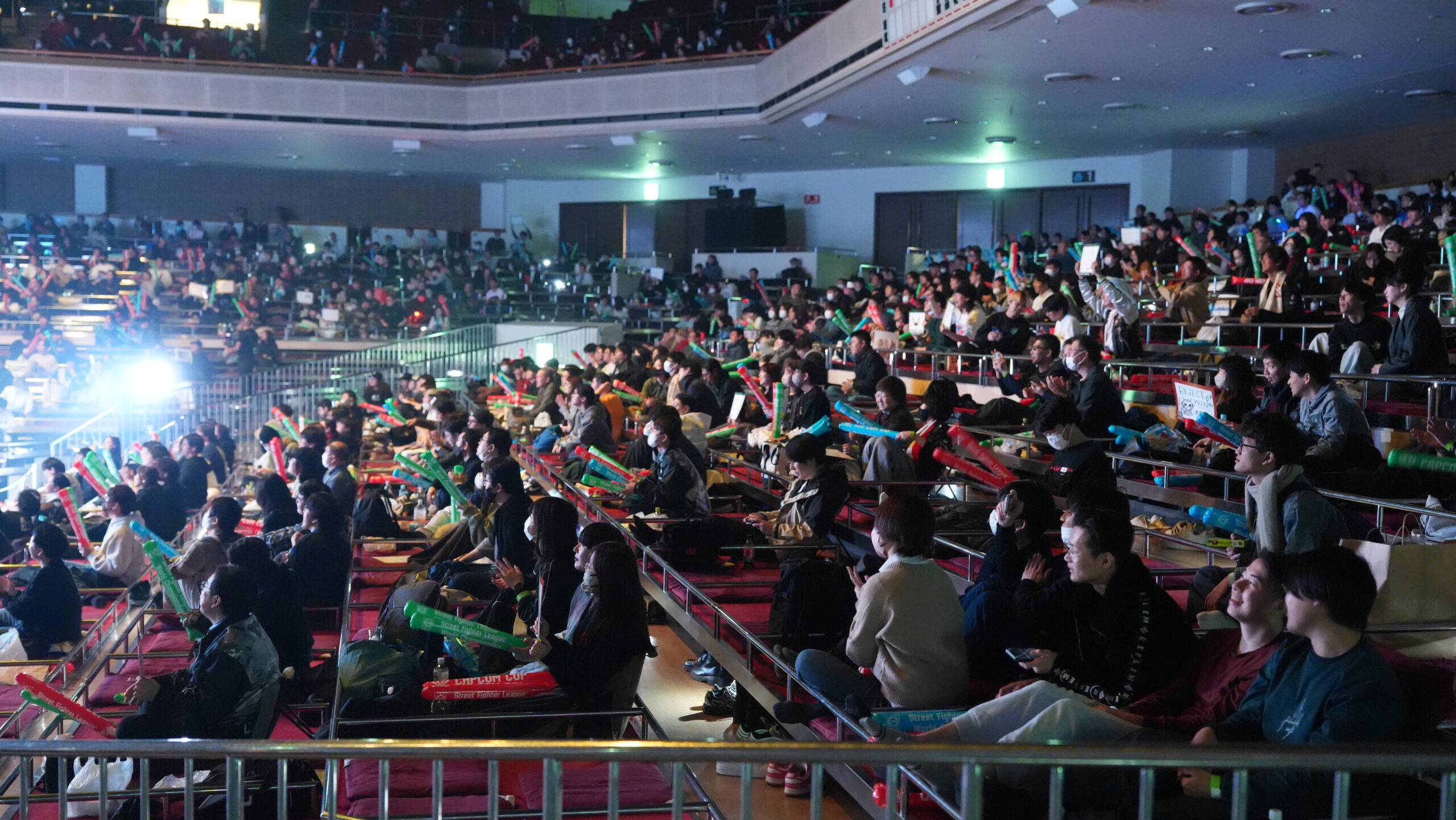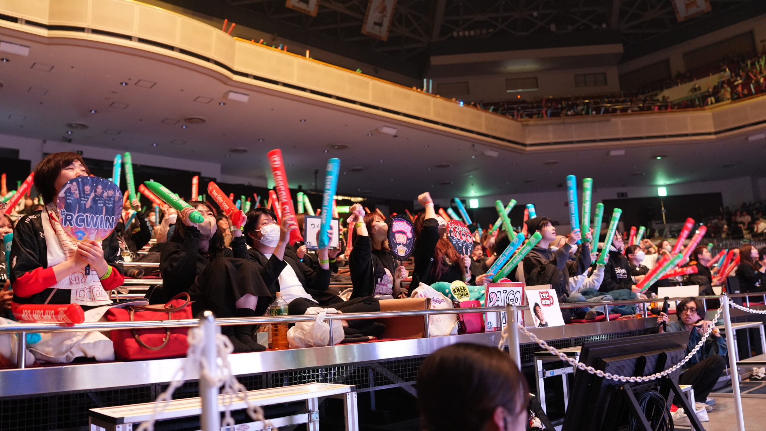 試合会場では、チアーボードやスティックバルーンを手にした観客が声援を送り、会場は大きな熱気に包まれていた。さらに、自作のうちわを手に応援する来場者の姿も見られた。