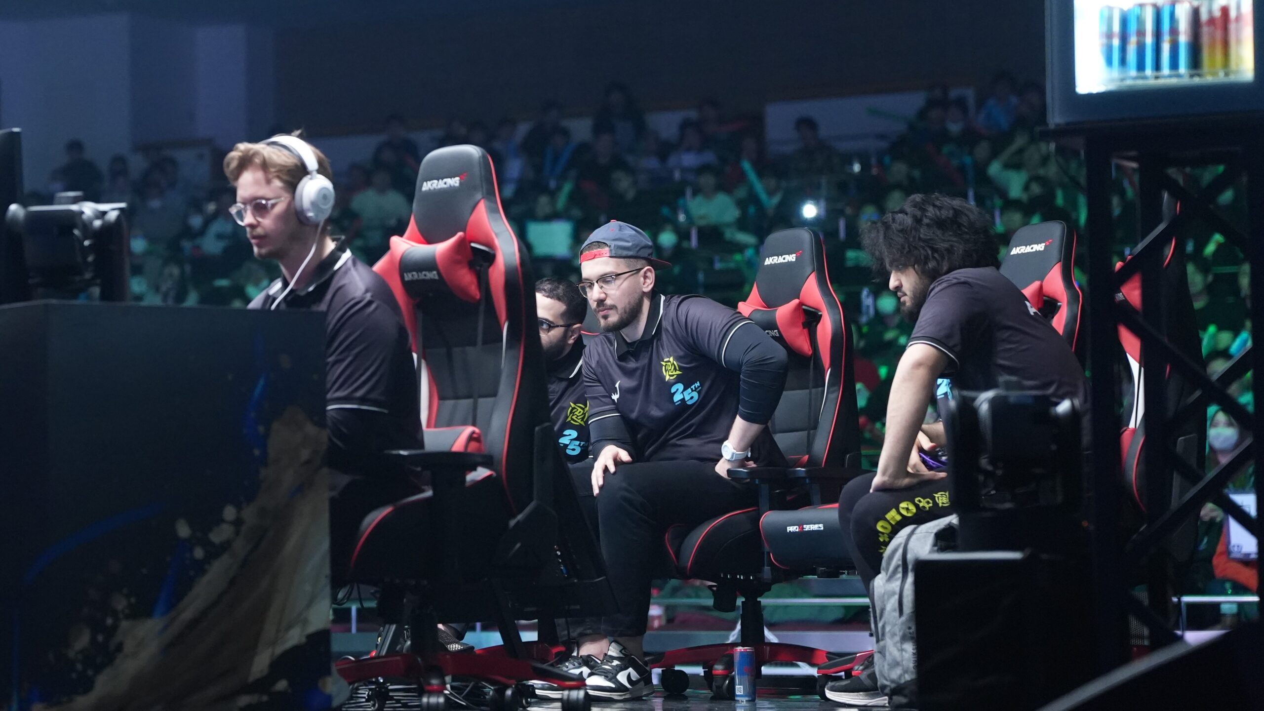 左から、Ninjas in Pyjamas Juicyjoe選手、Bravery選手、Weibo Gaming / Red Bull MenaRD選手